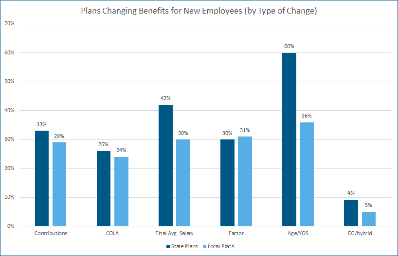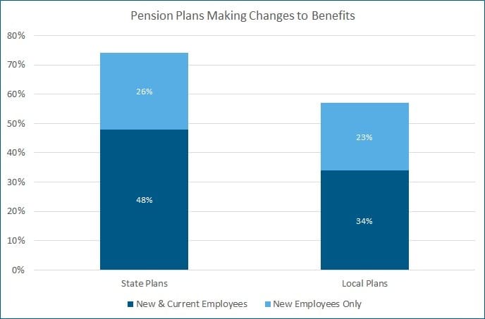 In contrast, only 57% of local plans have enacted reforms. New employees bore the brunt of changes to local plans: 34% of local plans made changes that affected only new employees, and 23% made changes that affected all employees.