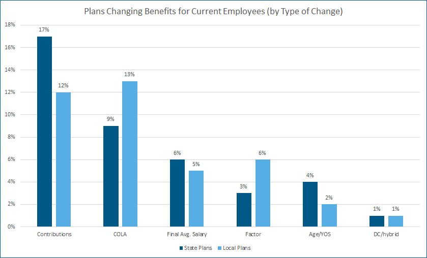 Among state plans, 17% increased employee contributions, and 9% reduced the COLA. Among local plans, 12% increased contributions and 13% reduced the COLA. In a handful of cases, state and local governments actually reduced core benefits for current employees.