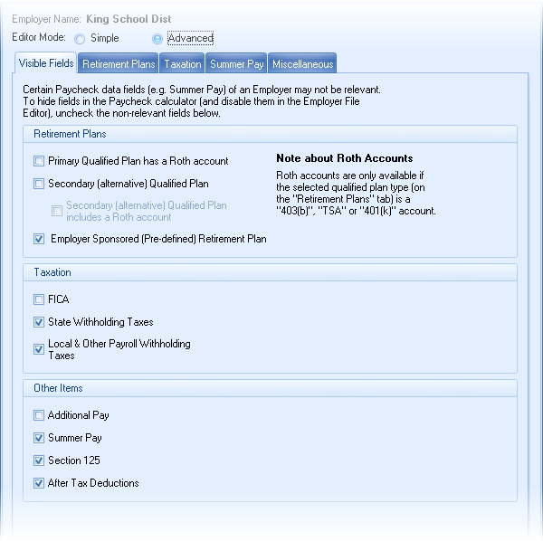 The Visible Fields tab allows for configuring the employer file's fields that are visible. It is only available when Advanced is selected as the Editor Mode. Some fields may or may not be used by all employers. For example, many employers will not have Summer Pay. Un-checking 'Summer Pay' (and other fields) has two benefits: